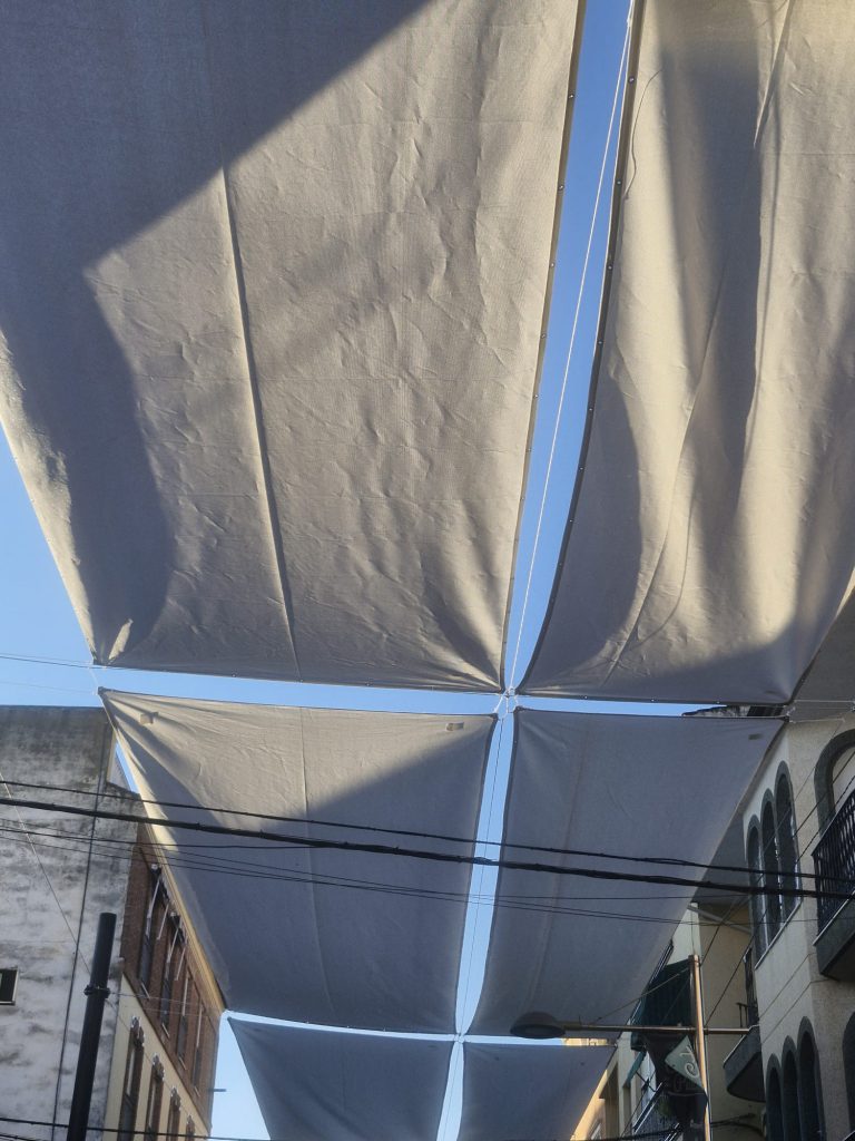 La intervención ha consistido en la instalación de entoldado en el entorno comercial y la colocación de balizas solares LED para la mejora de la iluminación y señalización. Estas actuaciones permiten: