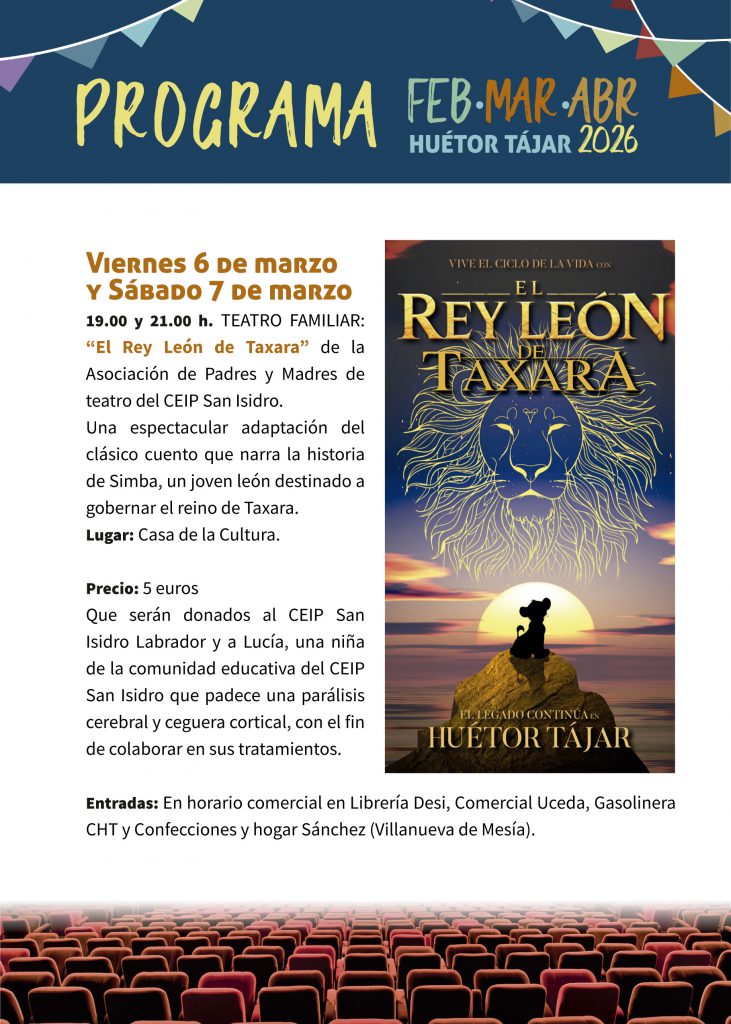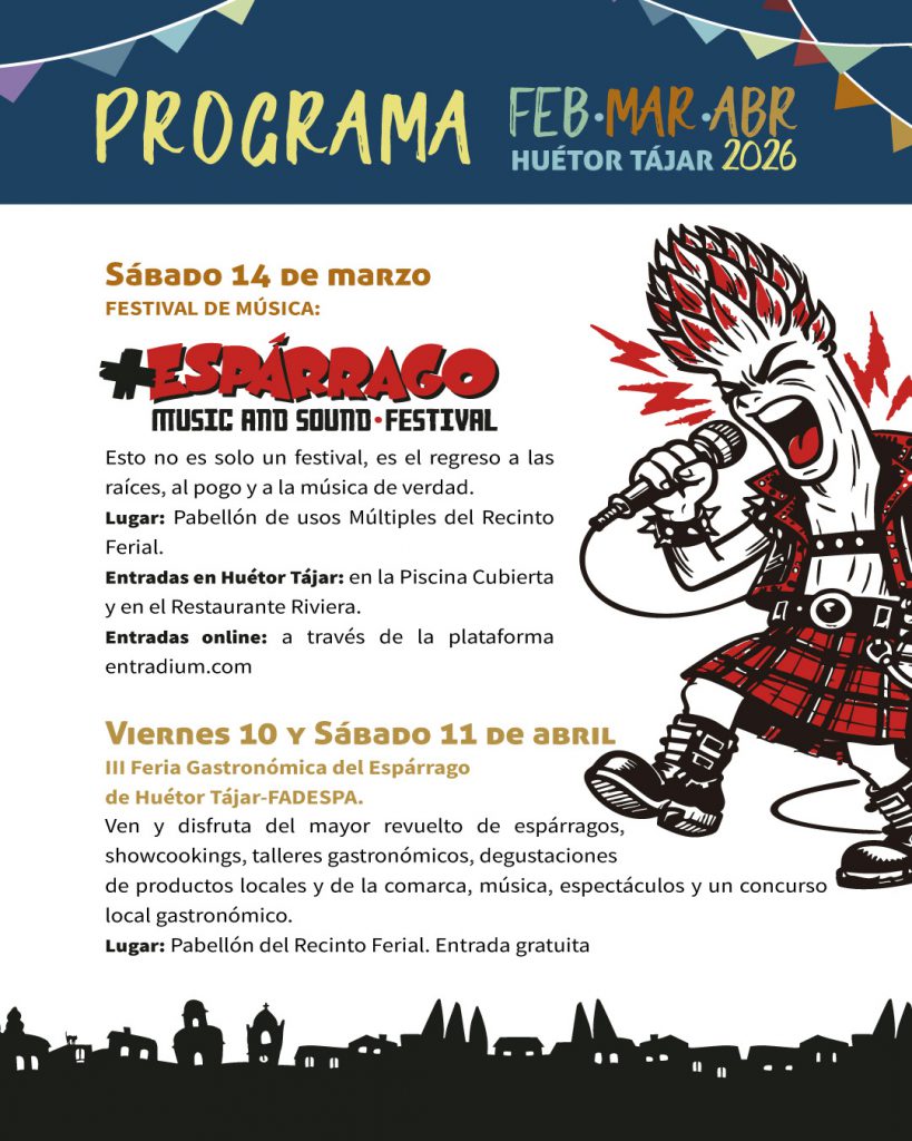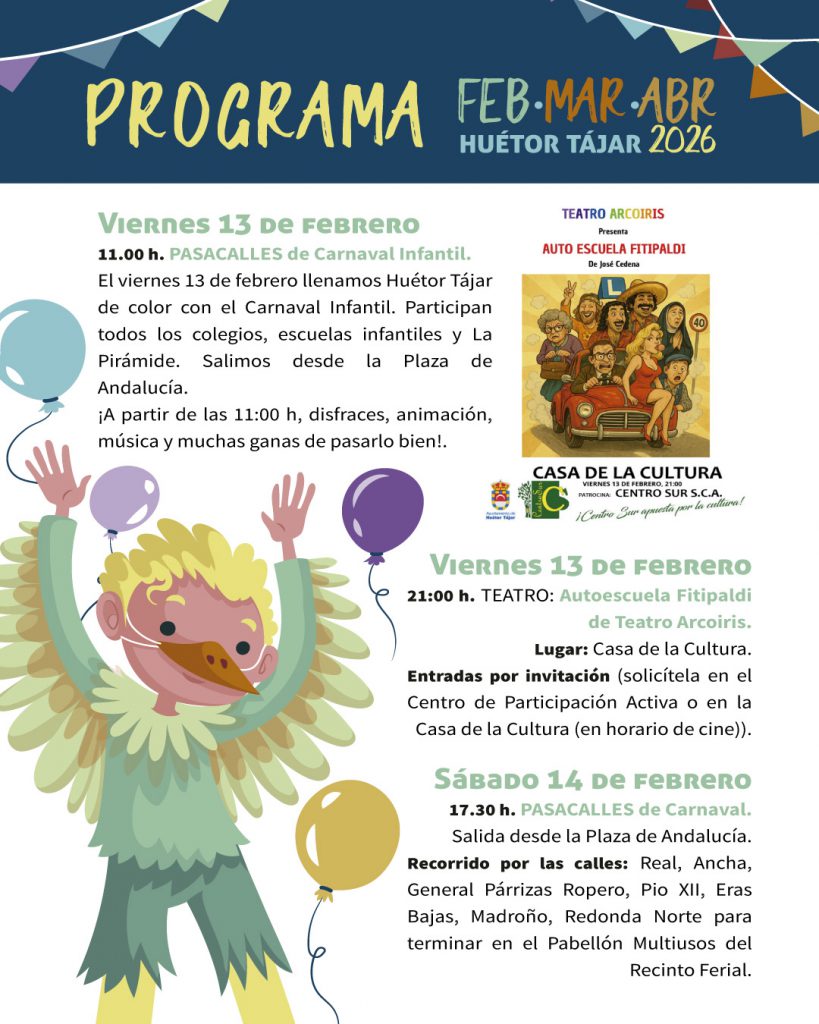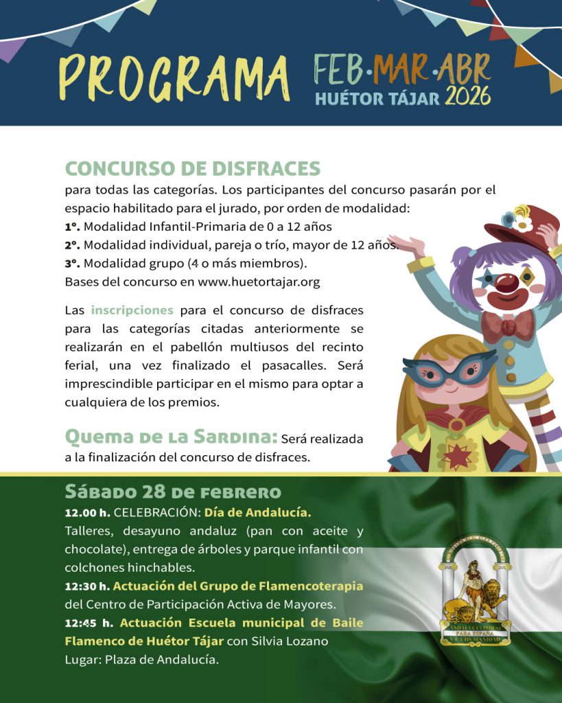 Huétor Tájar se prepara para vivir unos meses llenos de fiesta, cultura y diversión. Con la llegada del Carnaval 2026, nuestro municipio se llenará de color, música y tradición, dando el pistoletazo de salida a la programación de actividades que se extenderá durante los meses de febrero, marzo y abril.